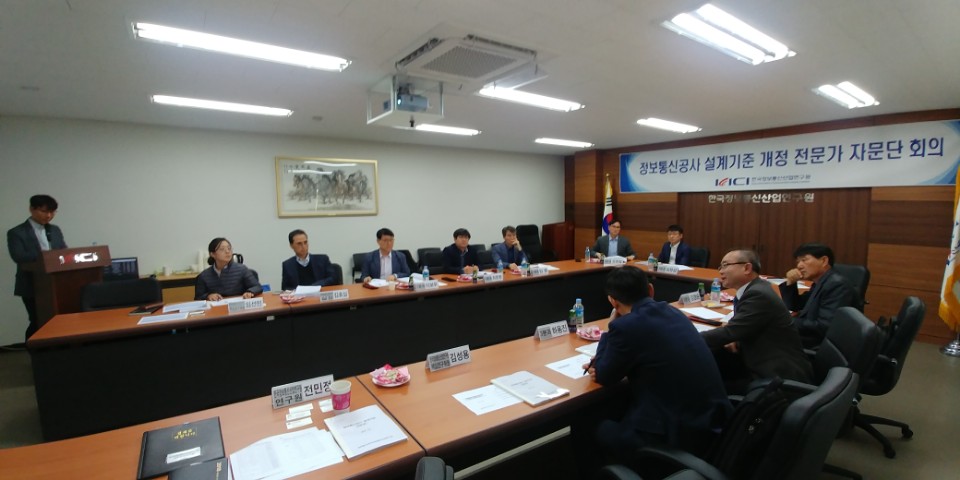 [연구원소식] 「정보통신 공사 설계기준 개정」제1차 전문가 자문위원회가. 일 시 : 2018. 04. 18.(수) 16:00 나. 장 소 : 한국정보통신산업연구원 회의실 다. 참 석 자 : 설계기준 전문가 자문위원 8명 등 총 12명 라. 회의 주요내용 o 정보통신 공사 설계기준 제정 등 현황 보고 o 연구범위 및 서술방향, 분과별 설계기준 검토 및 개정안 작성방향 토의