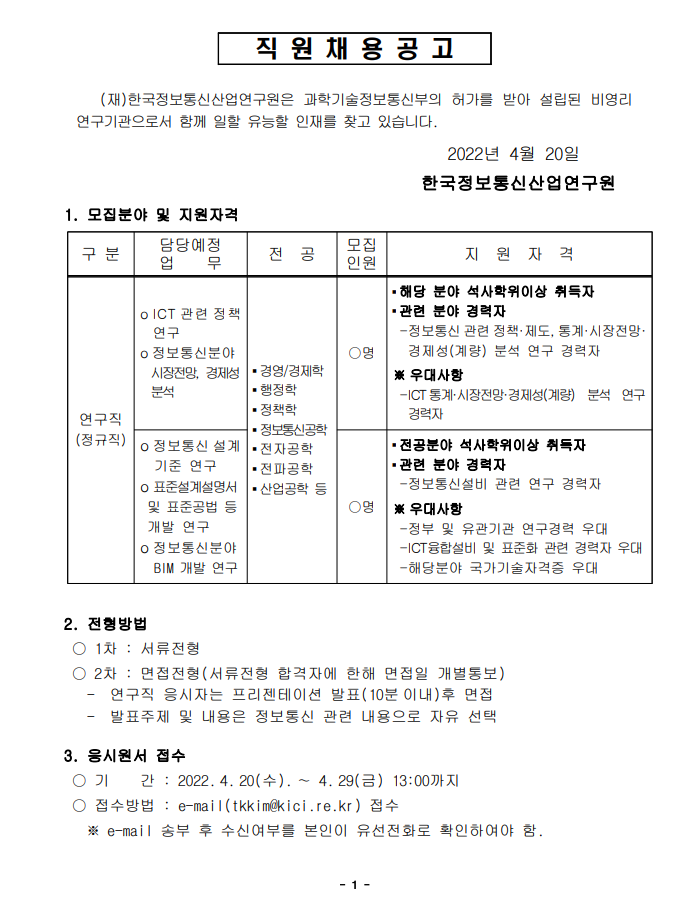 [입찰/채용] 마감 [마감] 2022년 직원(정규직) 모집 공고문(2022.4.29까지) -