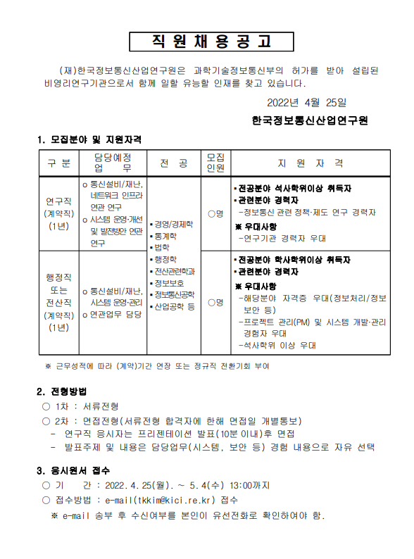 [입찰/채용] 마감 [마감] 2022년 직원(계약직) 1차 모집 공고문(2022.5.4까지)