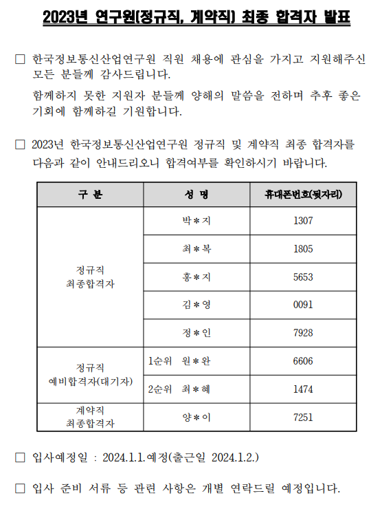 [입찰/채용] 마감 2023년 연구원(정규직, 계약직) 최종 합격자 발표 -