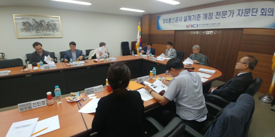 [연구원소식] 「정보통신 공사 설계기준 개정」제1차 전문가 자문위원회가. 일 시 : 2018. 04. 18.(수) 16:00 나. 장 소 : 한국정보통신산업연구원 회의실 다. 참 석 자 : 설계기준 전문가 자문위원 8명 등 총 12명 라. 회의 주요내용 o 정보통신 공사 설계기준 제정 등 현황 보고 o 연구범위 및 서술방향, 분과별 설계기준 검토 및 개정안 작성방향 토의