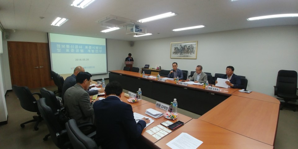 [연구원소식] 2018년 제1차 표준시방서·공법 T/F실무 회의 개최가. 일 시 : 2018. 05. 25.(금) 11:00 나. 장 소 : 한국정보통신산업연구원 1층 회의실 다. 참 석 자 : T/F자문위원 5명, 연구원 4명 라. 회의 주요내용 o 정보통신공사 표준시방서 및 공법 개발연구 추진 현황 보고 o 표준시방서 및 공법 개발연구 검토결과 토의
