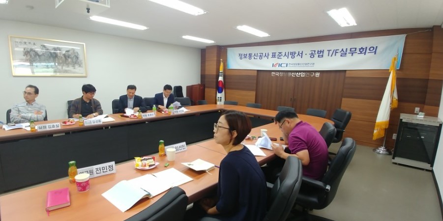 [연구원소식] 2017년 제2차 표준시방서·공법 T/F실무 회의가. 일 시 : 2017. 09. 21.(목) 10:00 ~ 12:00 나. 장 소 : 한국정보통신산업연구원 1층 회의실 다. 참 석 자 : T/F자문위원 3명, 연구원 3명 라. 회의 주요내용 o 정보통신공사 표준시방서 및 공법 개발연구 추진 현황 보고 o 표준시방서 및 공법 개발연구 검토결과 토의