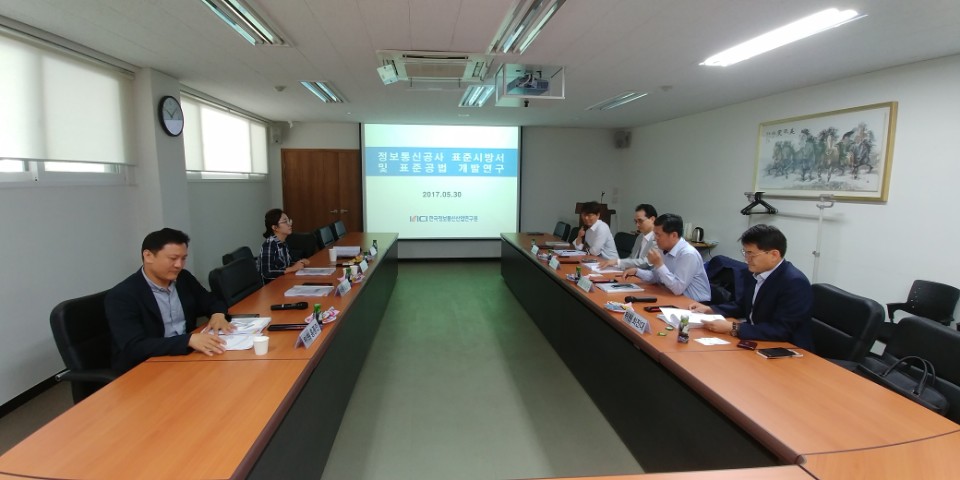 [연구원소식] 2017년 제1차 정보통신공사 표준시방서·공법 T/F 실무회의 개최가. 일 시 : 2017.05.30.(화) 10:00 ~ 12:00 나. 장 소 : 한국정보통신산업연구원 1층 회의실 다. 참석인원 : 표준시방서ㆍ공법 T/F위원 라. 주요 안건 o 정보통신공사 표준시방서ㆍ공법 개발연구 추진 현황 보고 o 전원 및 접지 연구방향 및 범위 토의 o 표준시방서 및 공법 개발연구 검토결과 토의 o 기타토의