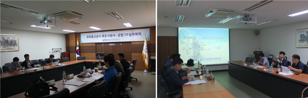 [연구원소식] 2016년 제2차 표준시방서·공법 T/F실무회의 개최가. 일 시 : 2016. 9. 23.(금) 16:00 ~ 18:00 나. 장 소 : 연구원 회의실 다. 참 석 자 : T/F자문위원 3명, 연구원 4명 라. 회의 주요내용 o 정보통신공사 표준시방서 및 공법 개발연구 추진 현황 보고 o 표준시방서 및 공법 개발연구 검토결과 토의