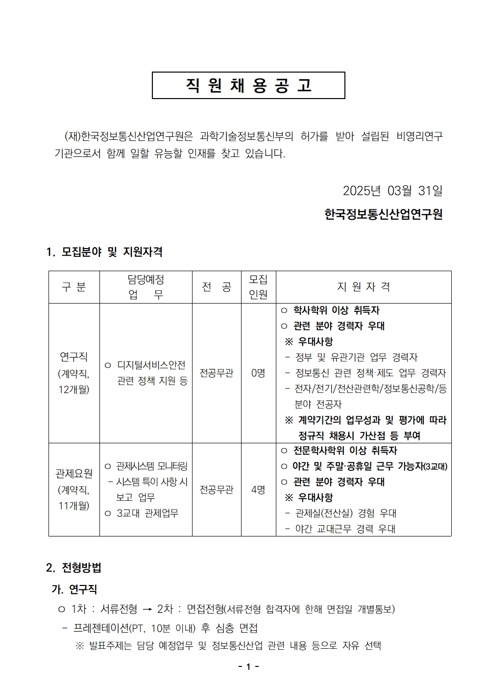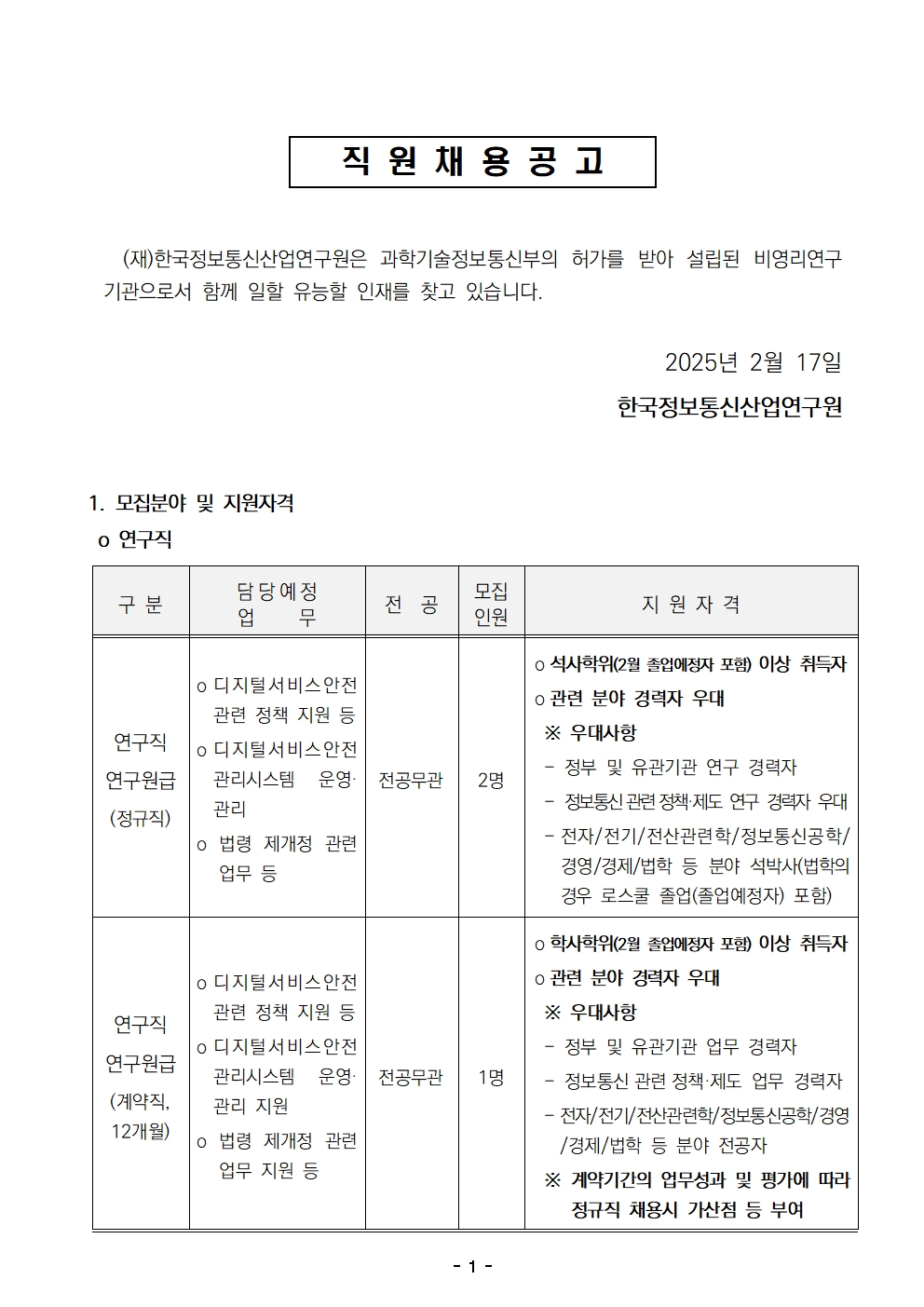 [채용공고] 마감 2025년 상반기 1차 연구원 모집 공고 안내(2025.3.4까지)