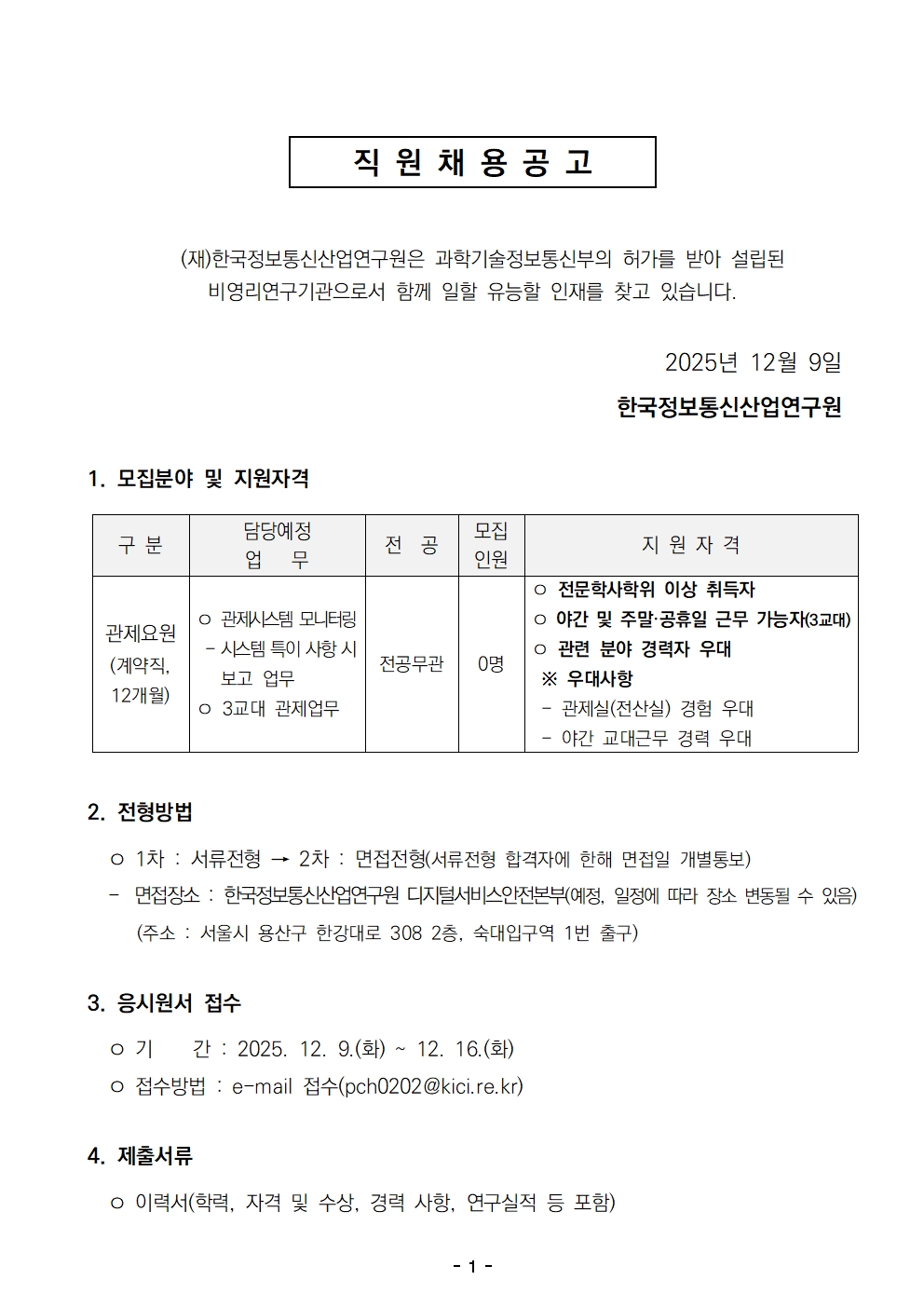 [채용공고] 마감 2025년 하반기 관제요원(계약직) 모집 공고 안내(2025.12.16까지) -